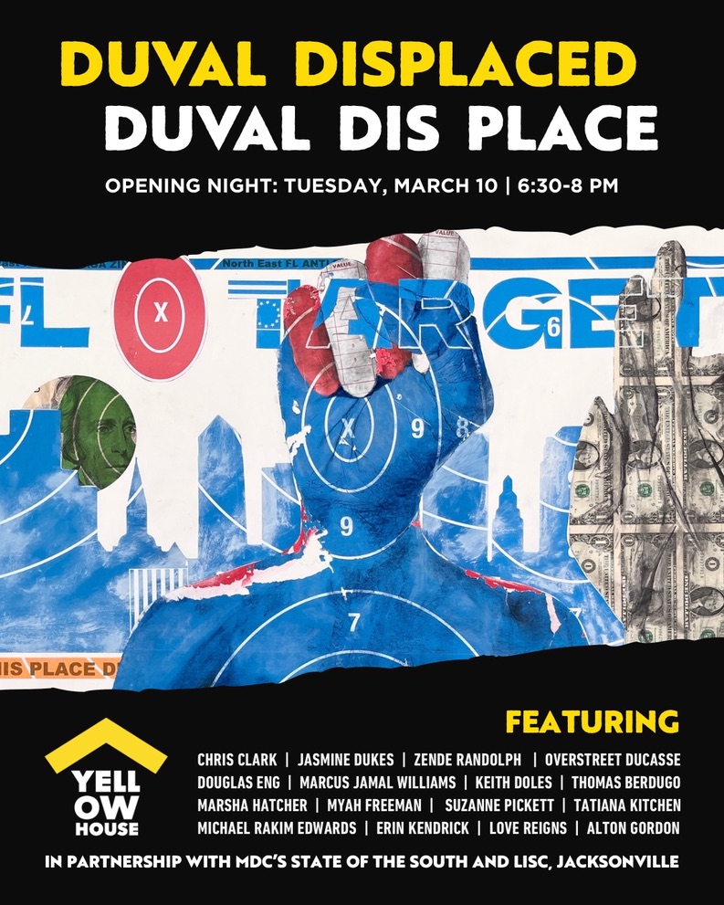 This exhibition is the result of a partnership between MDC’s State of the South, LISC Jacksonville, Yellow House and 16 Jacksonville-based visual artists and poets.Created as a core part of State of the South’s annual convening taking place here for the first time, the exhibition amplifies themes of displacement, climate justice, community identity, racism, economic equity, wellness, and the reimagining necessary to create a more just society – here and throughout the region.The show is both a critique and a celebration of this place we call Duval.